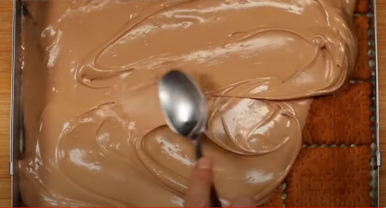 Απλώστε όλο το μείγμα σοκολάτας πάνω από την δευτερη βάση μπισκότου.