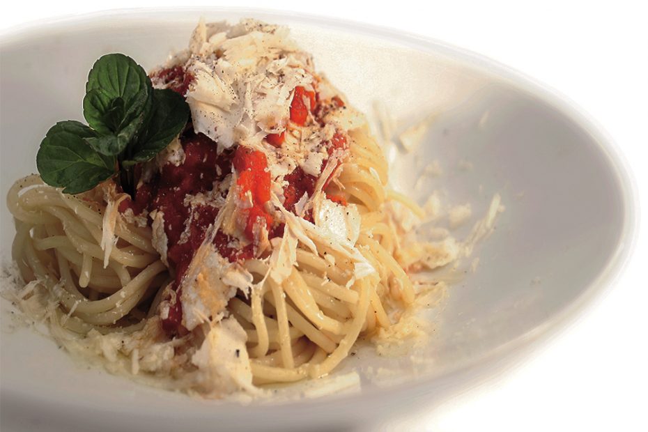 Τοποθετήστε το ένα τρίτο του ζυμαρικού σε μια πιατέλα για σερβίρισμα και πασπαλίζετε με ένα τρίτο του τυριού και ένα τρίτο των ντοματών. Επαναλάβετε το ίδιο για δύο ακόμη φορές. Ζεσταίνετε το εναπομήναν ελαιόλαδο και το ρίχνετε πάνω στα ζυμαρικά. Ανακατώστε για να αναμειχθεί και να μαλακώσει το τυρί ώστε να λιώσει με το καυτό λάδι.