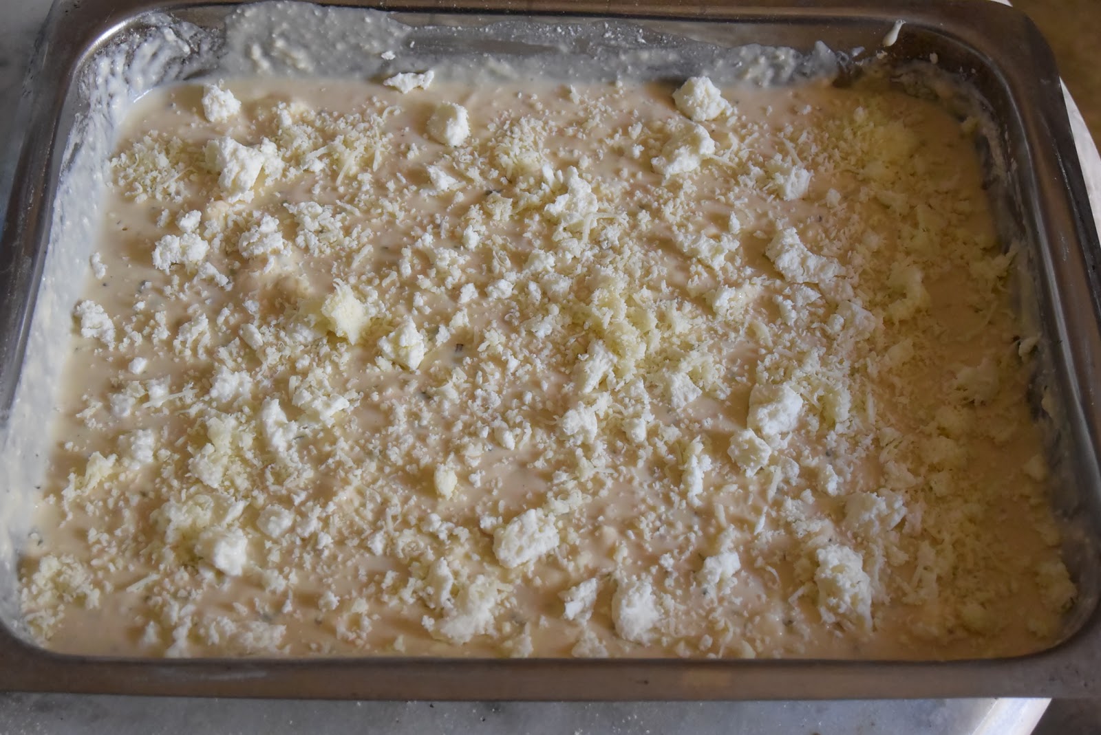 Σε μία λεκανίτσα ρίχνουμε τα 2 φλιτζάνια γάλα τα 2 αυγά το αλεύρι την φέτα σπασμένη με τα χέρια σε κομματάκια το αλατοπίπερο -προσοχή λίγο αλάτι- τον δυόσμο το αλεύρι και τέλος το γάλα με την αραιωμένη μαγιά.