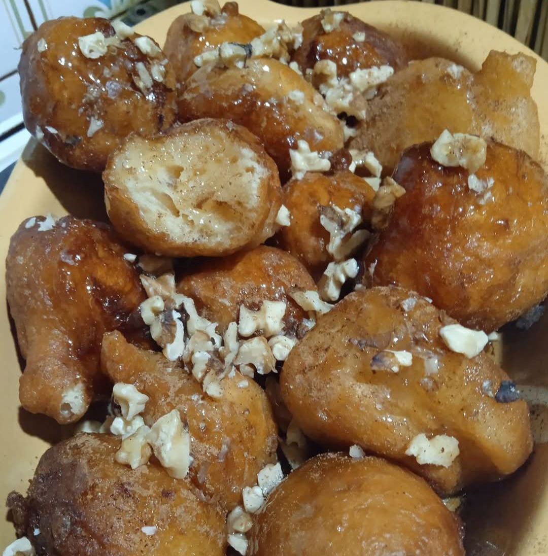 Σερβίρω τους λουκουμάδες ζεστούς, περιχυμένους με μέλι, κανέλα και καρύδια