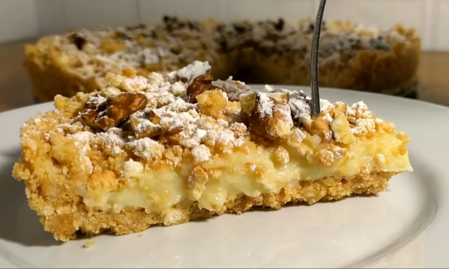 Βάζουμε στο ψυγείο μέχρι να είναι έτοιμο να συναρμολογήσουμε το κέικ. Ρίχνουμε την κρέμα στη βάση και μετά πασπαλίζουμε τους χοντροτριμμένους ξηρους καρπούς και απο πάνω το υπόλοιπο μισο μείγμα μπισκότου και από πάνω κομμάτια ξηρών καρπών και τέλος πασπαλίζουμε με ζάχαρη άχνη.