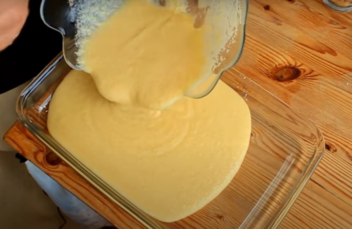 Ας ρίξουμε αυτό το μείγμα σε ένα γυάλινο πυρεξ και το ισιώνουμε. Δεν χρειάζεται να ανησυχείτε ότι θα είναι πολύ γλυκό. Ας το κρατήσουμε για 2 ώρες και αφήστε το να απορροφήσει το νερό.
