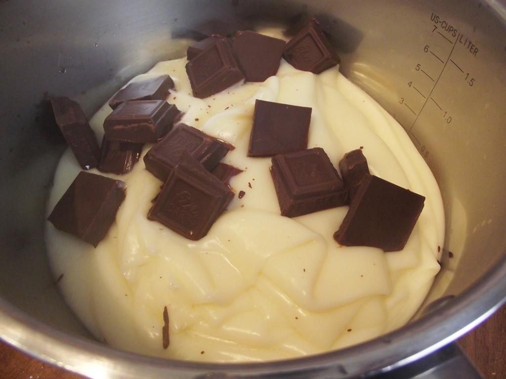 Ενσωματώστε γρήγορα, στο πρώτο μέρος, τη μαύρη σοκολάτα που χωρίζεται σε κομμάτια και 2 κουταλάκια του γλυκού ρούμι.