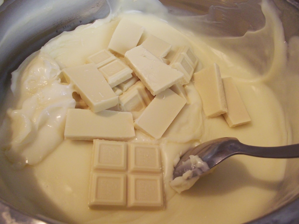 Στο δεύτερο μέρος ενσωματώνουμε τη σπασμένη λευκή σοκολάτα και 2 κουταλάκια του γλυκού λεμονιού.
