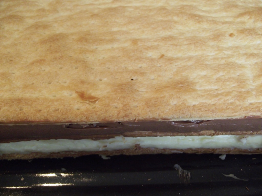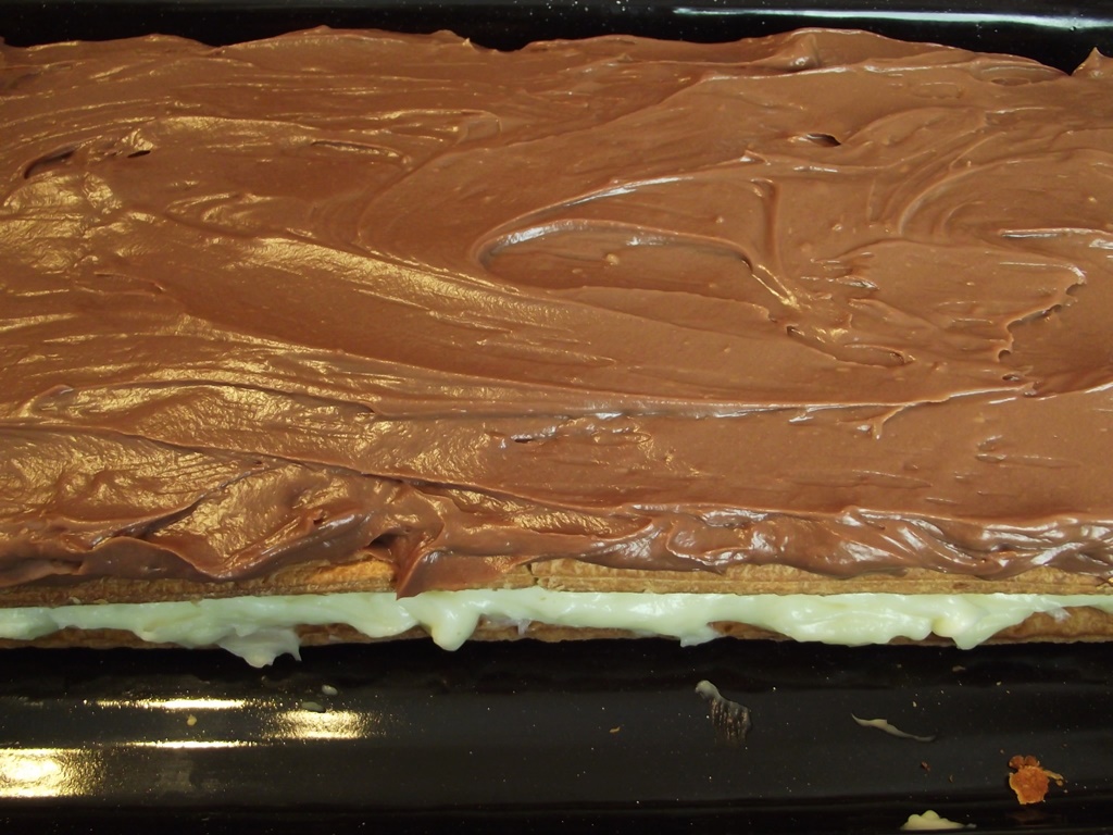 Απλώστε τις κρύες κρέμες μεταξύ των φύλλων σφολιατας και δώστε ένα υπέροχο γλυκό κρέμα με κρέμες σε δύο χρώματα καλυμμένες με φυλλο σφολιατας και ελαφρώς πιεσμένες.