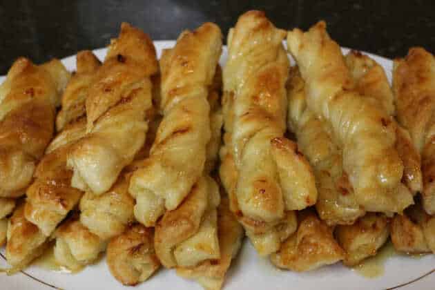 Με ένα κοφτερό μαχαίρι κόβετε τη σφολιάτα σε λωρίδες με πλάτος περίπου 3 εκατοστά και μήκος 8 έως 10 εκατοστά. Κρατώντας κάθε λωρίδα από τις άκρες, την στρίβετε προσεκτικά και την τοποθετείτε σε ταψί στρωμένο με λαδόκολλα