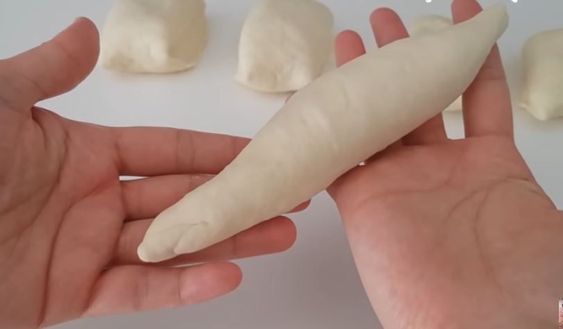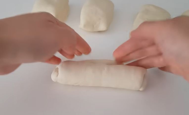 Παίρνουμε το ένα κομμάτι ζύμης το ανοίγουμε ελαφρώς με το χέρι σε ένα τετράγωνο διπλώνουμε προς τα μέσα και τυλίγουμε.