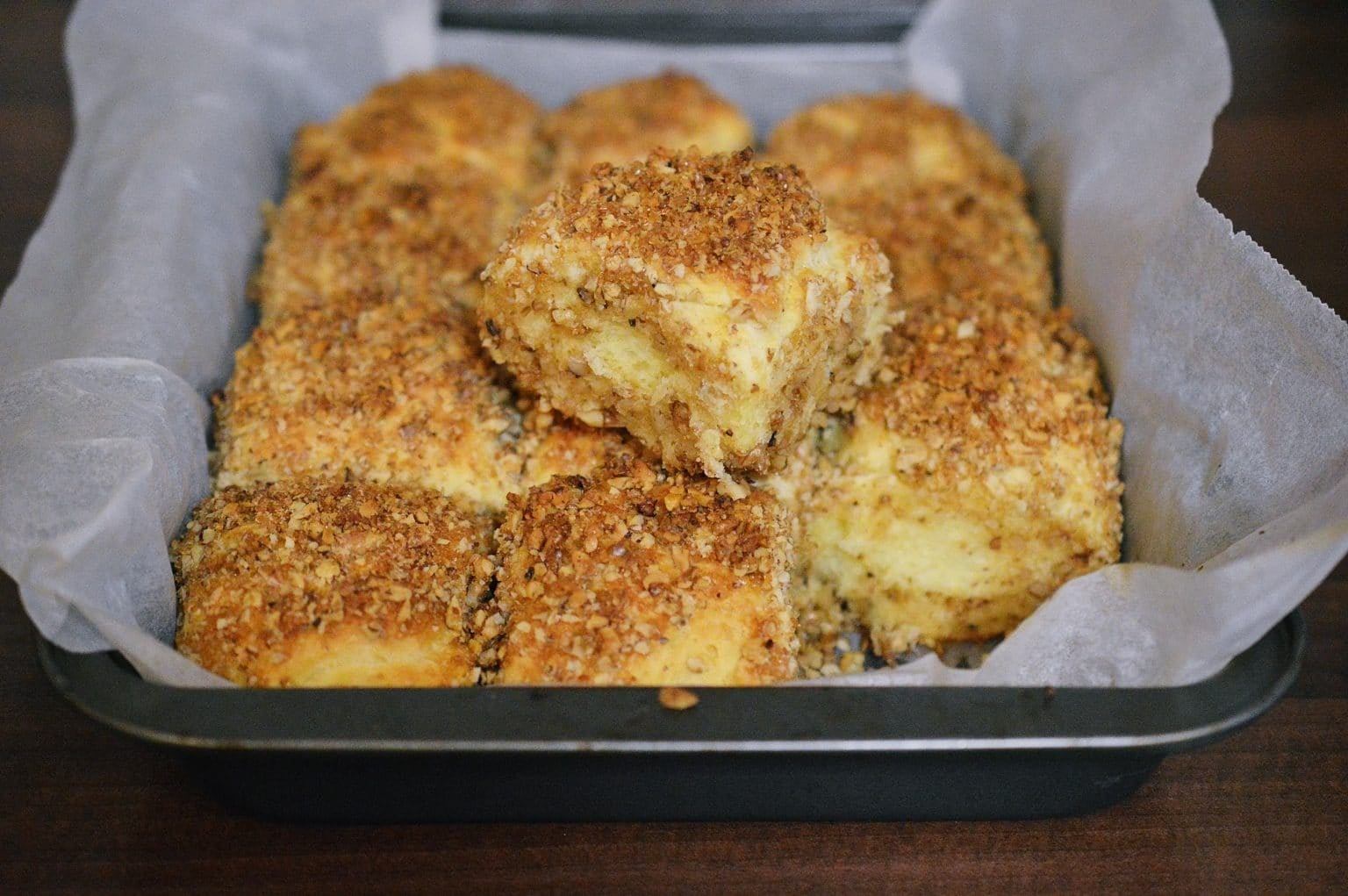 Ετοιμάζουμε αλεσμένα καρύδια ανακατεμένα με ζάχαρη κατά βούληση και ένα δίπλα ένα μπολ με λιωμένο βούτυρο.  Βάζουμε χαρτί ψησίματος στο ταψί.