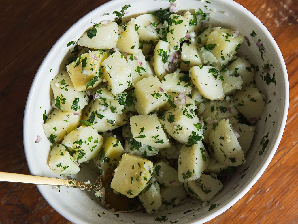 Προσθέστε το μείγμα με το κρεμμύδι στις πατάτες και ανακατέψτε. Σερβίρετε σε θερμοκρασία δωματίου.
