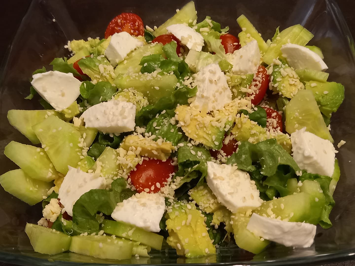 Τέλος αφού έχουμε κάνει το dressing το προσθέτουμε από πάνω στη σαλάτα και πασπαλίζουμε με το σουσάμι και το τυρί.