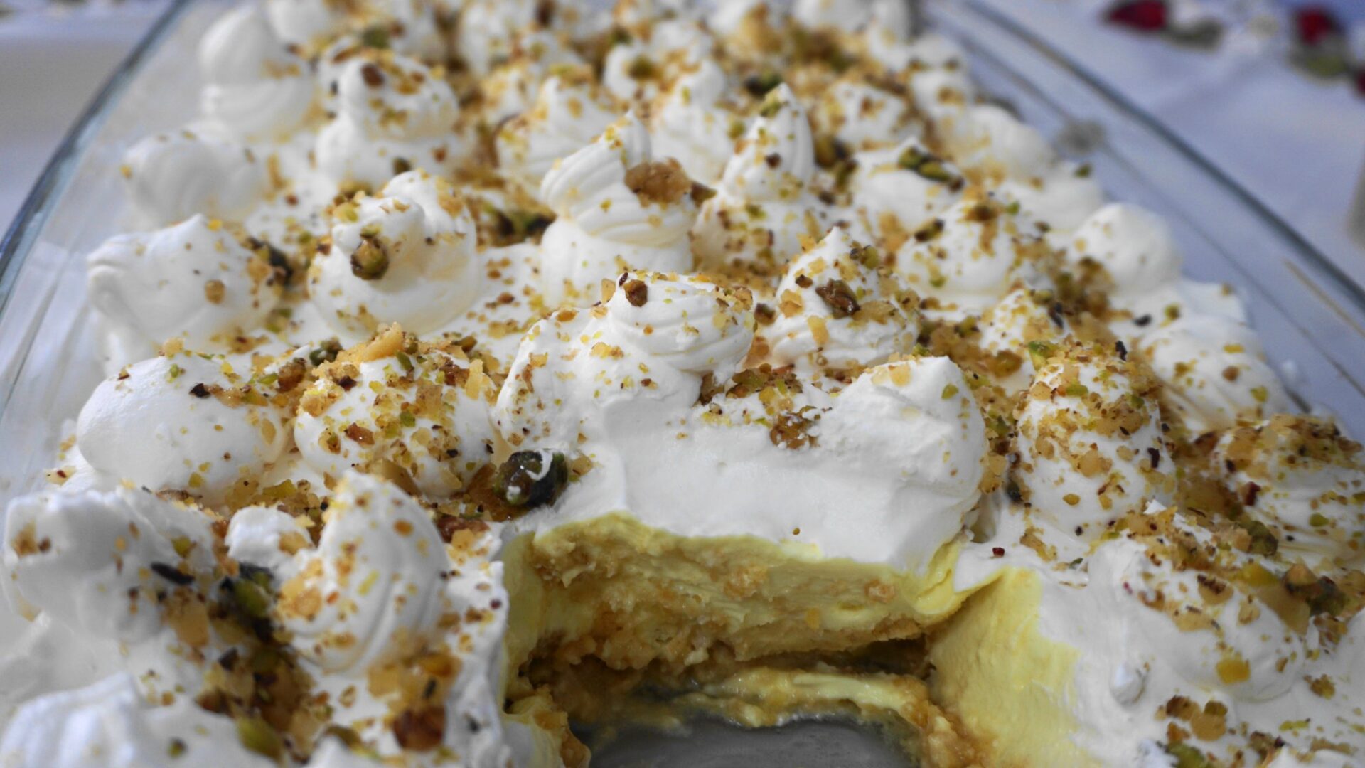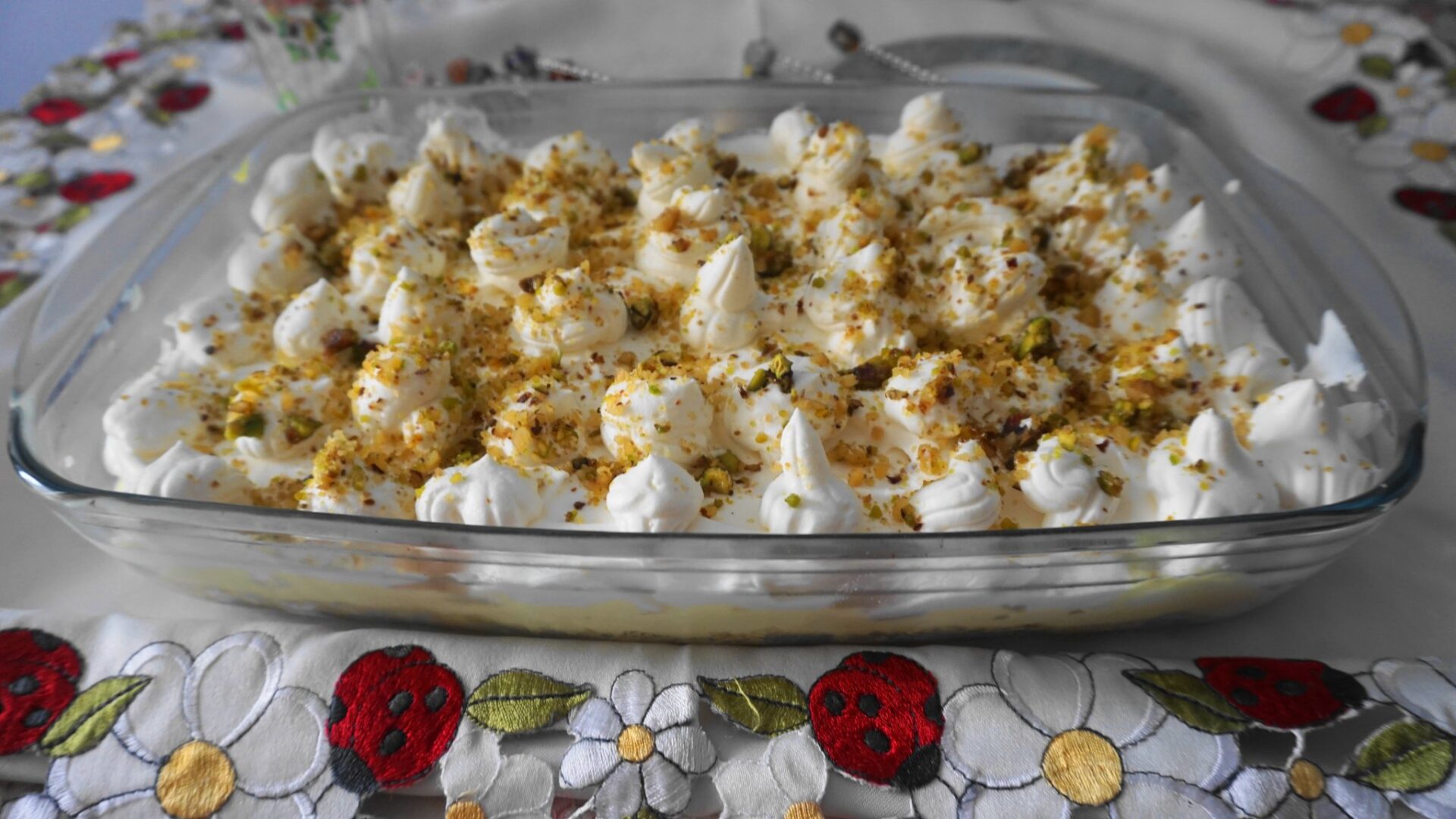 Στη συνέχεια στρώνουμε τη μισή σαντιγύ πάνω από την κρέμα. Μεταφέρουμε την υπόλοιπη σαντιγύ σε κορνέ. Κάνουμε ροζέτες ή σχεδιάκια. Αν δεν έχουμε κορνέ χρησιμοποιούμε ένα κουτάλι ή ένα πιρούνι για να δώσουμε κυματισμούς ή σχέδια στην επιφάνεια.