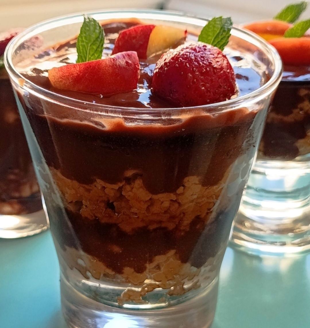 Εύκολο και δροσερό γλυκάκι με στρώσεις μπισκότου, αφράτης σοκολατένιας κρέμας και φρέσκων φρούτων. Ιδανικό για τον απογευματινό καφέ χωρίς ψήσιμο!