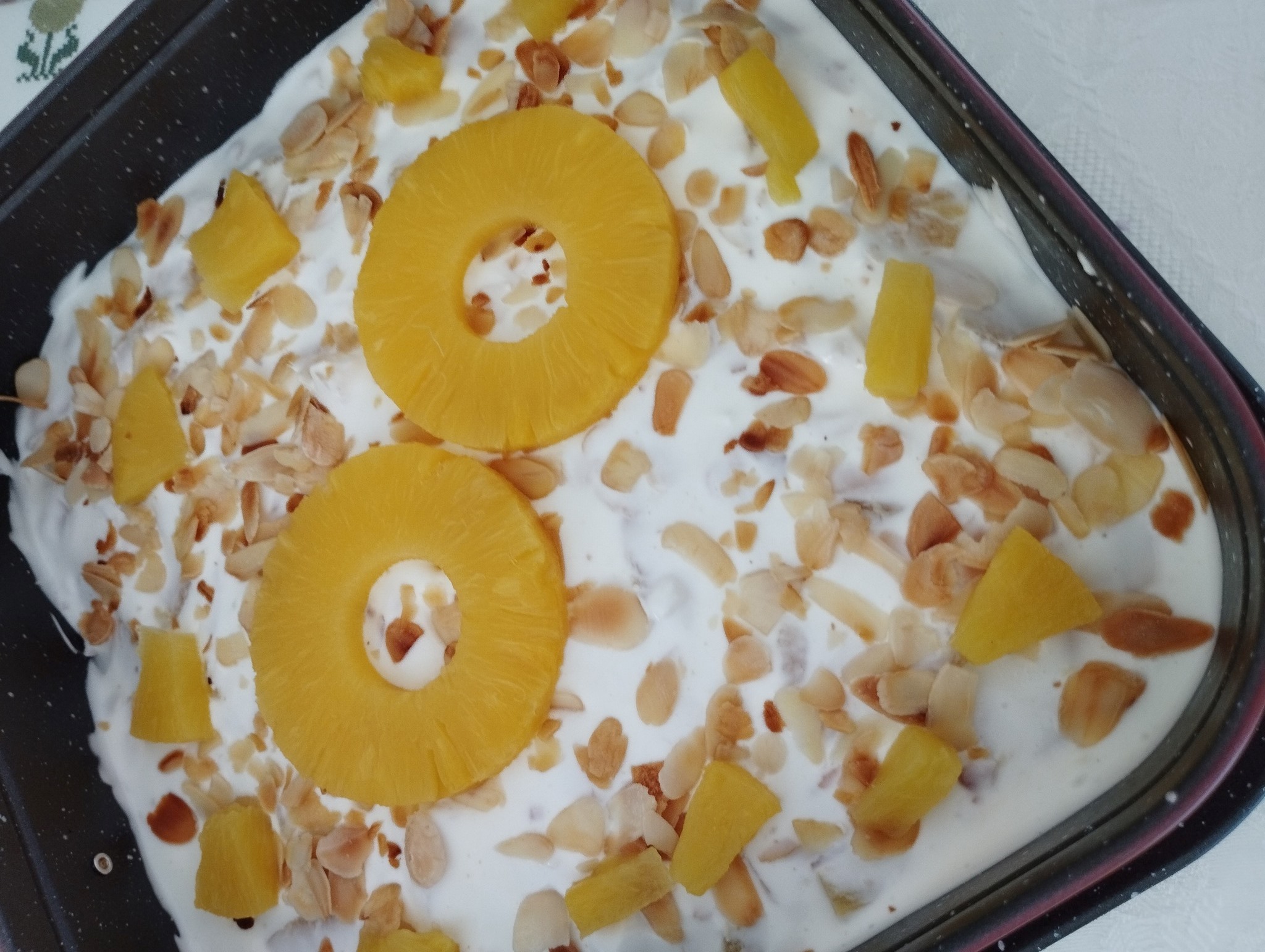 - Πάνω από τη στρώση των μπισκότων, ρίχνουμε ομοιόμορφα το μείγμα γιαουρτιού-κρέμας. Το στρώνουμε καλά με μια σπάτουλα και στη συνέχεια διακοσμούμε την επιφάνεια με τα αμύγδαλα και τις ροδέλες ανανά που είχαμε αφήσει στην άκρη. Τέλος, τοποθετούμε το γλυκό στο ψυγείο. Μετά από περίπου δύο ώρες, είναι έτοιμο να το απολαύσουμε παγωμένο.