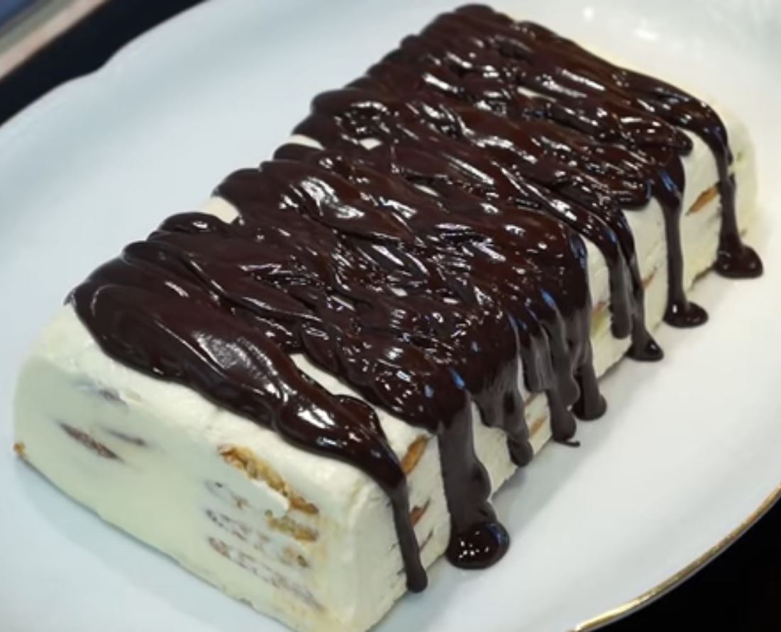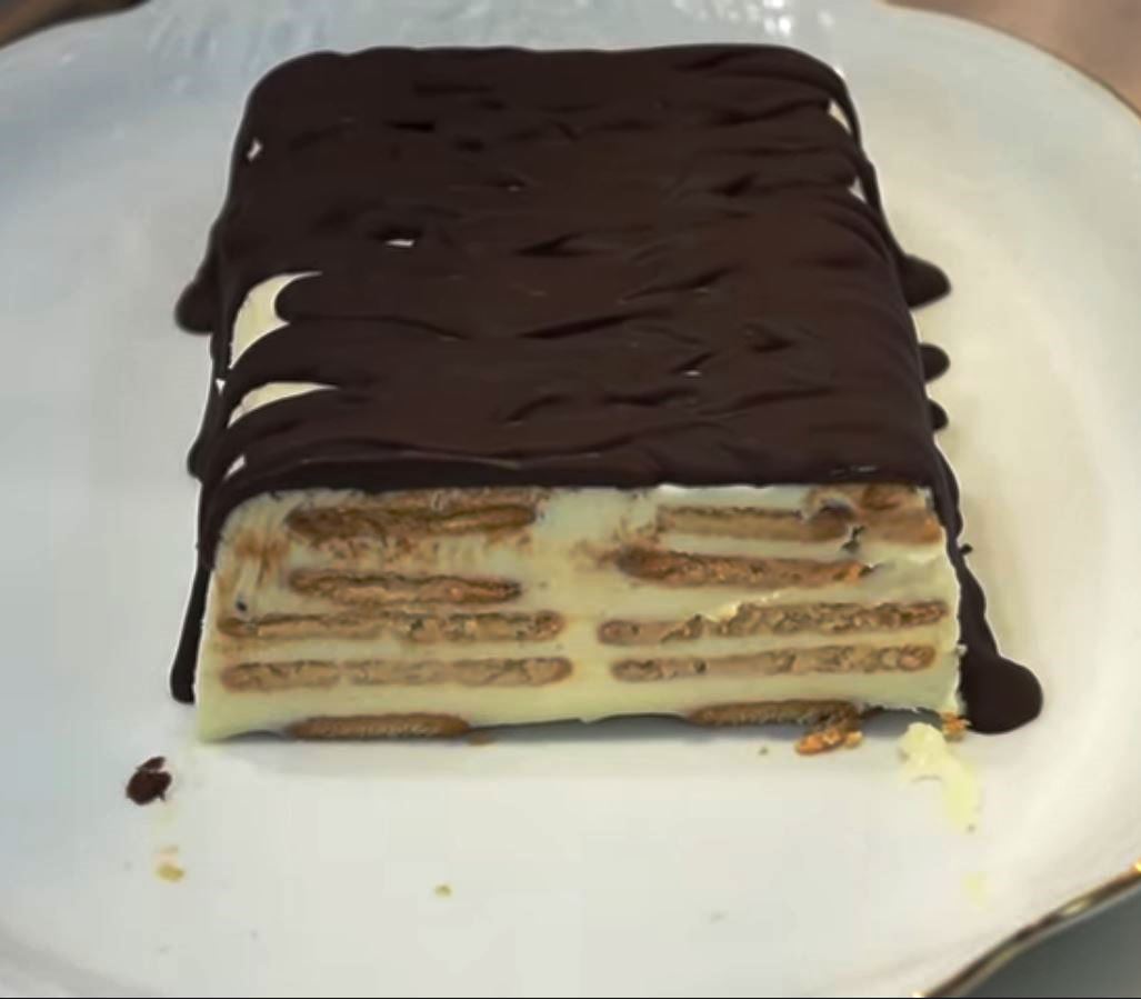Στρώνουμε την βάση με κρέμα και από πάνω καλύπτομαι με μπισκότα, επαναλαμβανουμε το ίδιο 3 φορές ακόμη και τελειώνουμε με μπισκότα από πάνω(4 στρώσεις κρέμα-μπισκότο).Βάζουμε στο ψυγείο για να πήξει η κρέμα 6-7 ώρες αλλά είναι καλύτερα να μείνει όλο το βράδυ. Όταν το βγάλουμε από το ψυγείο το χαλαρώνουμε λίγο με ένα μαχαίρι στο πλάι και το γυρίζουμε ανάποδα σε μια πιατέλα και αφαιρούμε την φόρμα και το χαρτί ψησίματος.