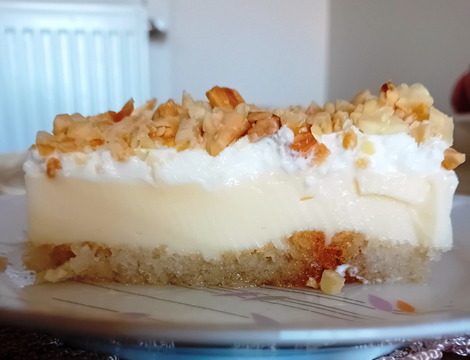 - Μόλις σφίξει απλώνουμε την κρέμα γάλακτος ( την οποία έχουμε χτυπήσει σε σαντιγί).