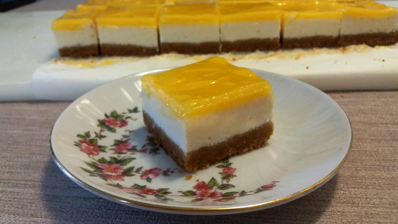 4. Βγάλτε το ταψί από το ψυγείο και ρίξτε αμέσως το κέικ με την γέμισμα του λεμονιού. Ισιώστε το και βάλτε το ξανά στο ψυγείο για περίπου μισή ώρα. Χρησιμοποιώντας χαρτί ψησίματος, βγάλτε το κέικ από το ταψί, τοποθετήστε το στην επιφάνεια εργασίας και κόψτε το σε κύβους με ένα κοφτερό μαχαίρι.