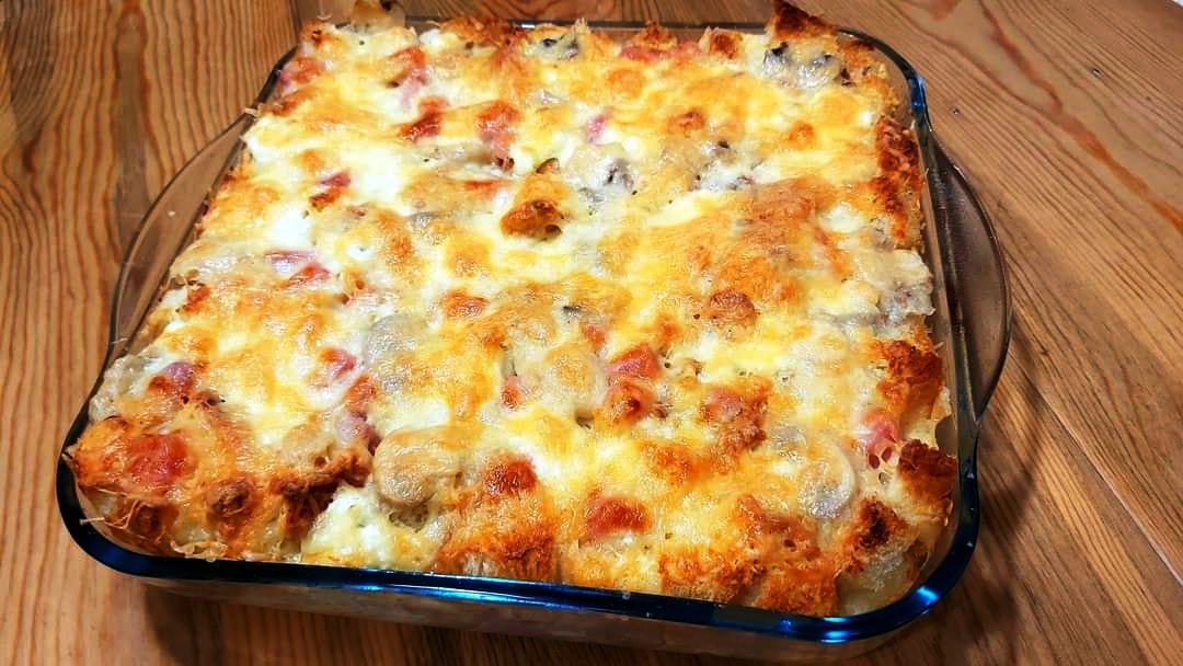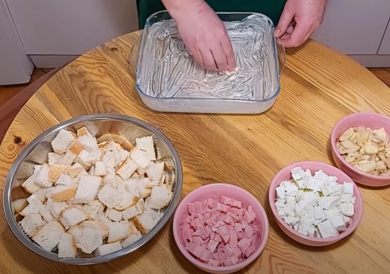 Ξεκινάμε και βουτυρώνουμε ένα πυρέξ καλα και στις πλευρές και απλωνουμε στην βάση τις μισές ποσότητες με την σειρά ψωμί-ζαμπόν-τυρί-μανιτάρια και μετά κάνουμε άλλη μια στρώση με την ιδια σειρά και αφήνουμε στην άκρη.