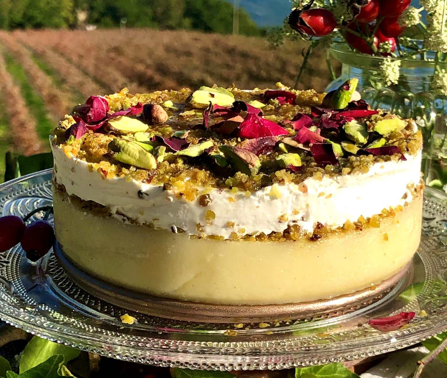 Είναι μια κρύα μεταξένια πουτίγκα με βάση το σιμιγδάλι, που ολοκληρώνεται με σαντιγί και γαρνίρεται με θρυμματισμένα φιστίκια Αιγίνης και αποξηραμένα ροδοπέταλα. Ολοκληρώθηκε με ένα αρωματικό σιρόπι ροδόνερου