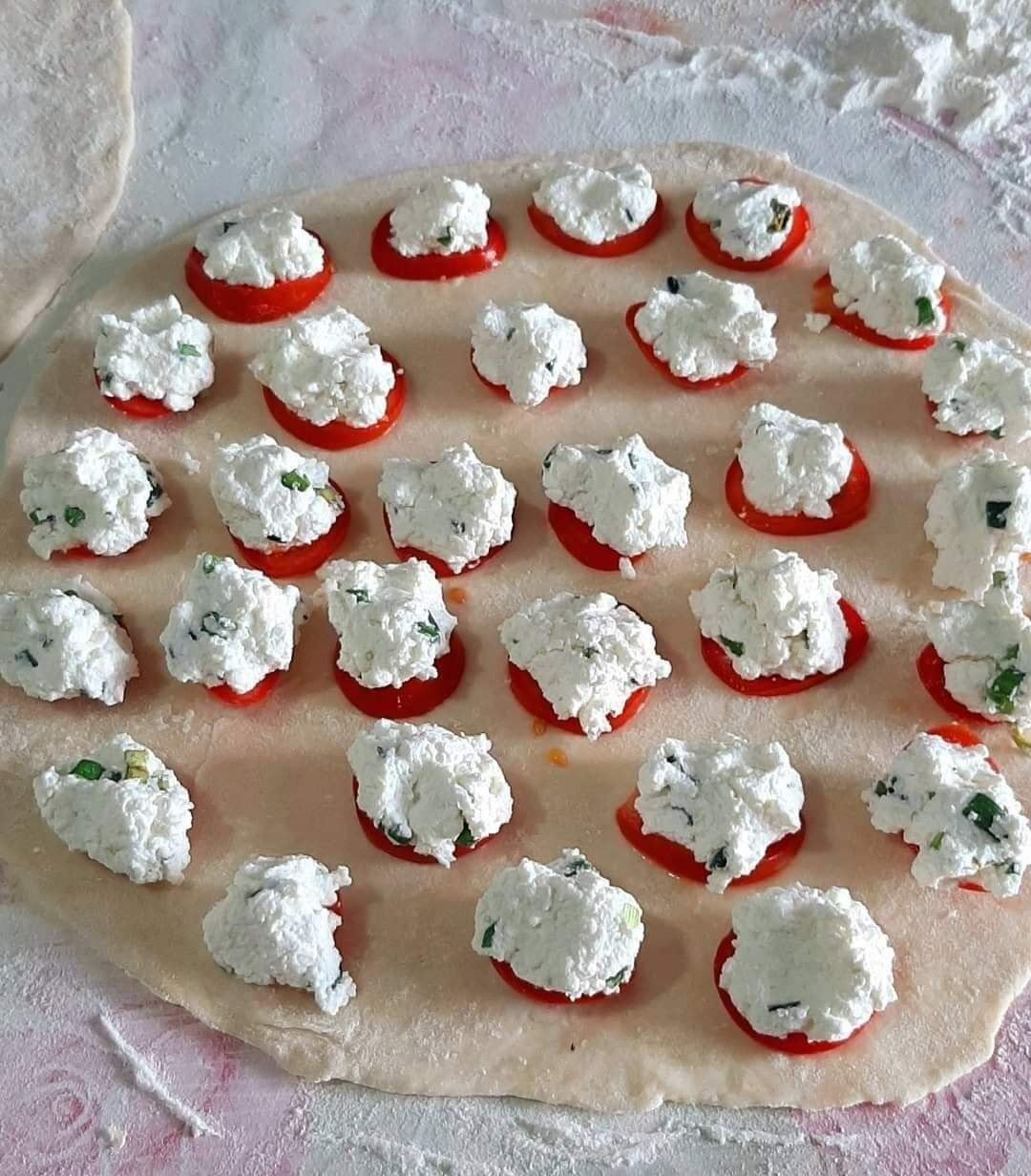 Τοποθετήστε τις φέτες ντομάτας στη ζύμη όχι πιο κοντά από 3 cm η μία από την άλλη.