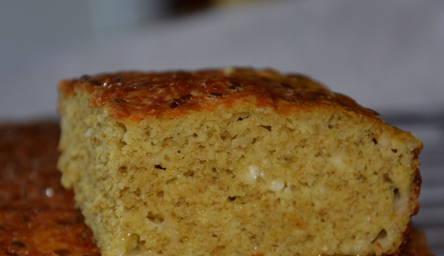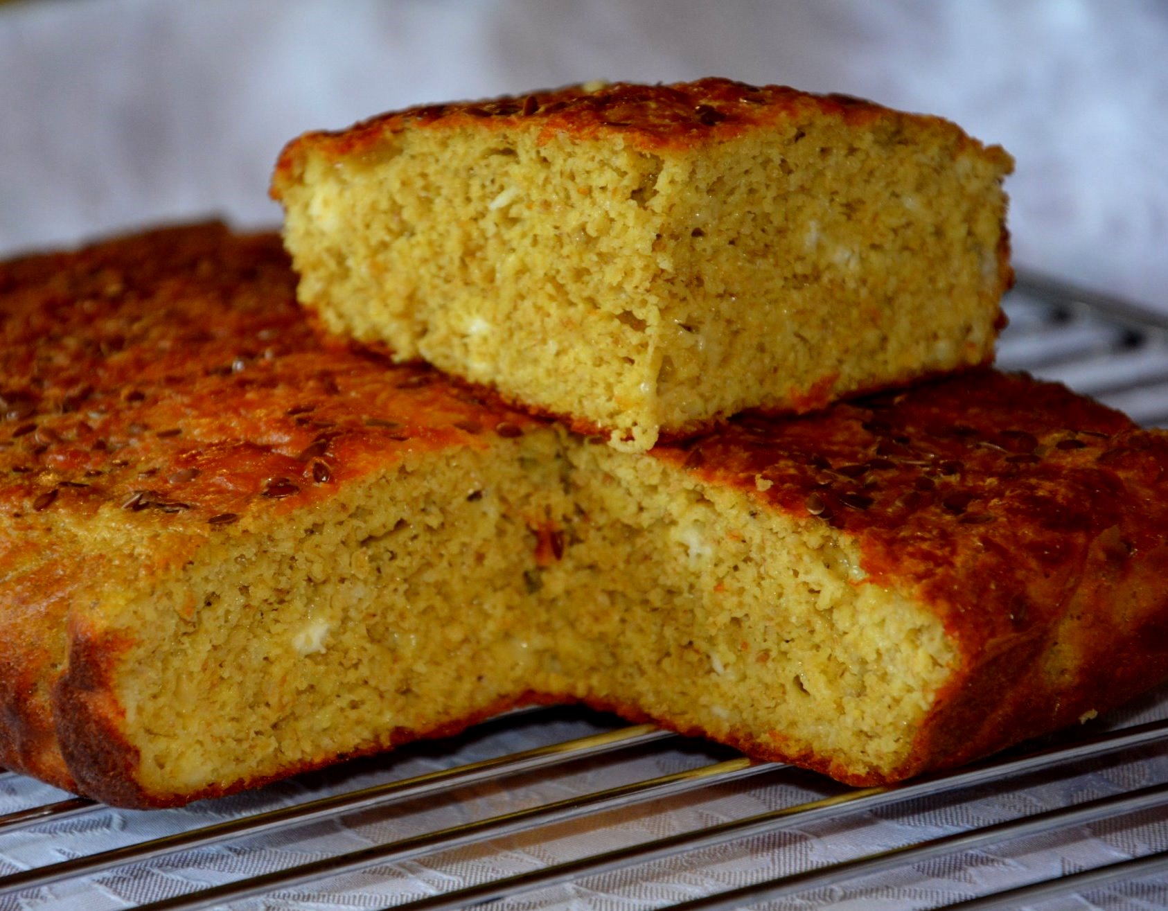Για τα αυγά δεν χρειάζεται να βγάλετε το μίξερ, τα χτυπάτε με το χέρι, προσθέτετε το γάλα και ανακατεύετε ξανά. Προσθέστε το μισό από το αλεύρι με το πίτουρο, μετά προσθέστε το κίτρινο τυρί και το τυρί και το υπόλοιπο αλεύρι, ανακατεύοντας μετά από κάθε προϊόν. Τέλος προσθέτουμε τον λιναρόσπορο και το λιωμένο βούτυρο.