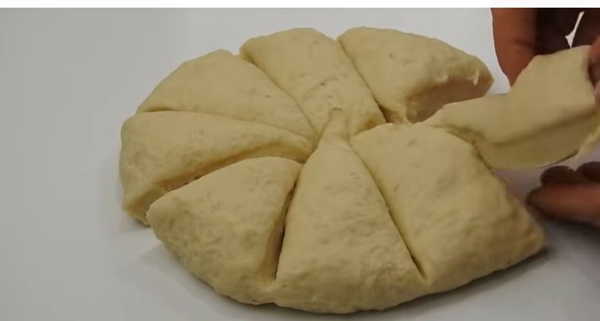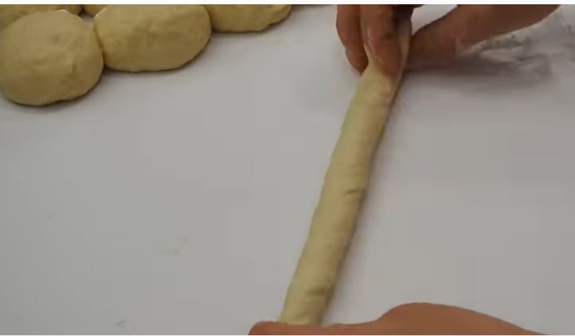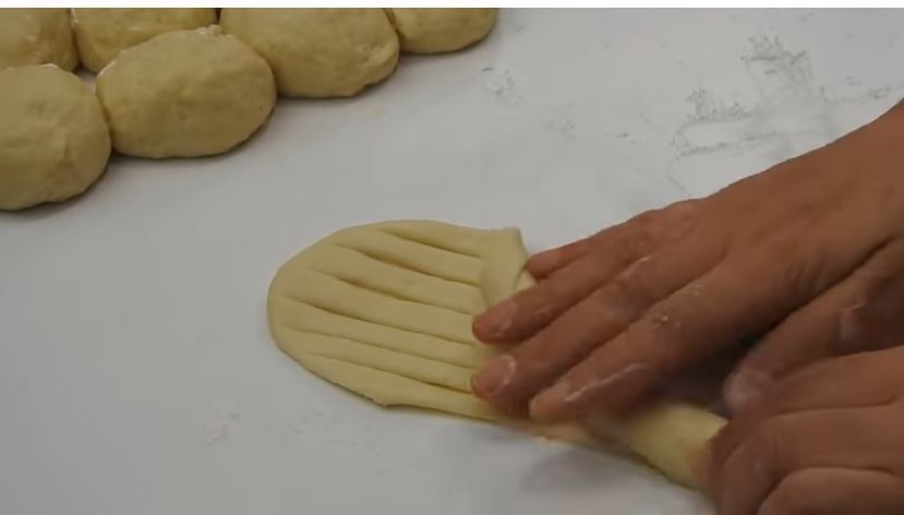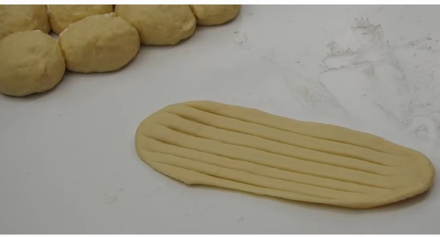 Περνούμε μία μία μπάλα και την ανοίγουμε σε ένα μακρόστενο οβάλ σχήμα και την χαράζουμε είτε με ένα μαχαίρι ή μια ρόδα κοπής πίτσας με 6 χαρακιές όπως βλεπετε στην φωτό.
