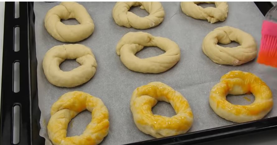Βάζετε τα κουλούρια σε ένα δίσκο στρωμένο με χαρτί ψησίματος και το αλείφουμε με τον κρόκο του αυγού.