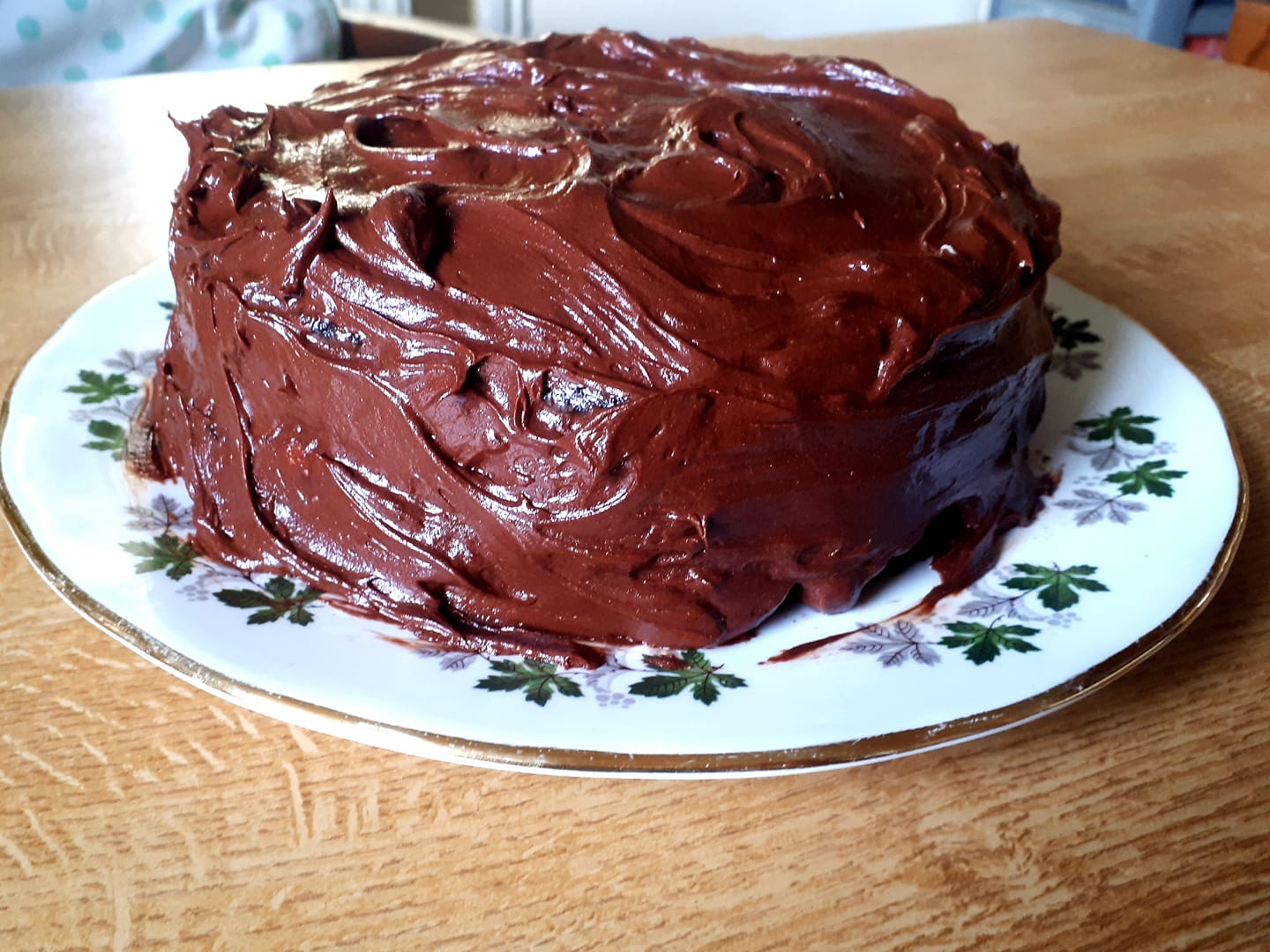 Λιώστε τη σοκολάτα σε μπεν μαρι, προσθέστε τις κουταλιές λάδι για λάμψη. Αφαιρούμε και αδειάζουμε σε ένα μικρό κύκλο στη μέση του κέικ και αρχίζουμε να γέρνουμε ελαφρώς στο πλάι για να απλωθεί σωστά. Ακολουθεί νέα μερίδα σοκολάτας και ούτω καθεξής μέχρι το τέλος της ποσότητας.