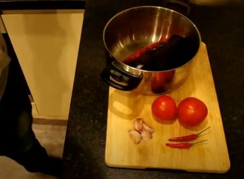 Εν τω μεταξύ καθαρίζουμε τα σκόρδα. Αρχίζουμε τώρα και ξεφλουδίζουμε την μελιτζάνα και την πιπεριά.