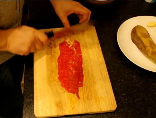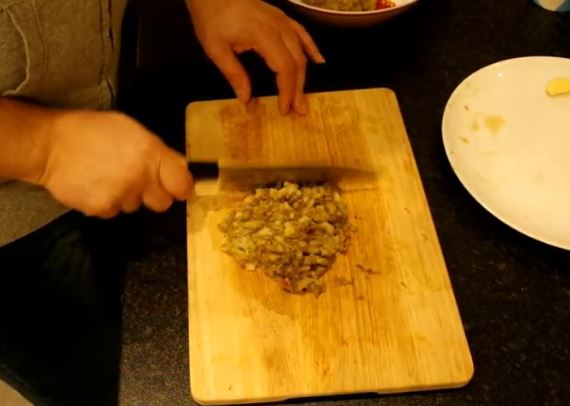 Αρχίζουμε τώρα και την ψιλοκόβουμε (σχεδόν την λιώνουμε) το ιδιο και την μελιτζάνα και τις βάζουμε στο πιάτο.