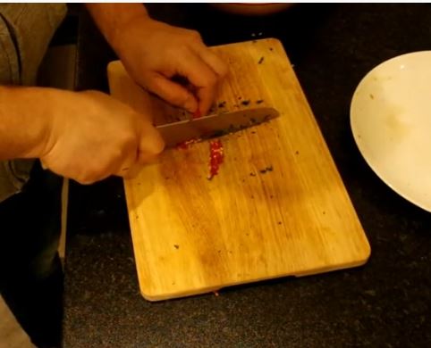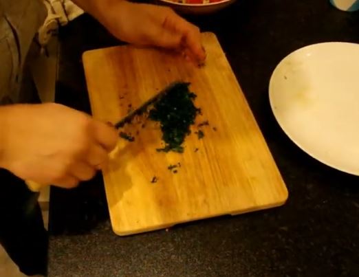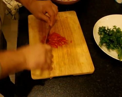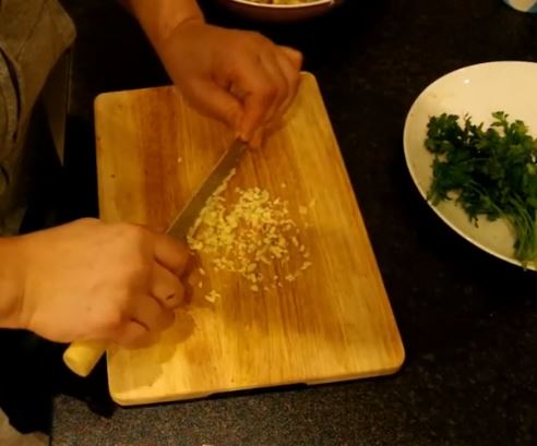 Συνεχίζουμε και ψιλοκόβουμε τα σκόρδα, τις ντομάτες και το μαιντανό, καυτερη πιπερίτσα και  τα ρίχνουμε όλα στο πιάτο.