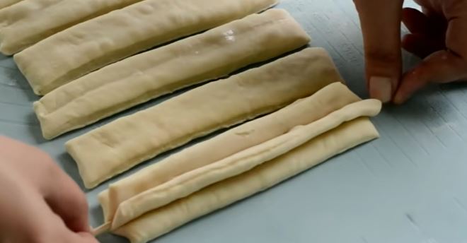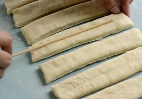 Στη συνέχεια παίρνουμε ένα καλαμάκι από σουβλάκι το βρέχουμε στο νερό και με αυτό κάνουμε με τη βρεγμένη πλευρά μία γραμμή στο κατα μήκος στo κέντρο κάθε sticks,