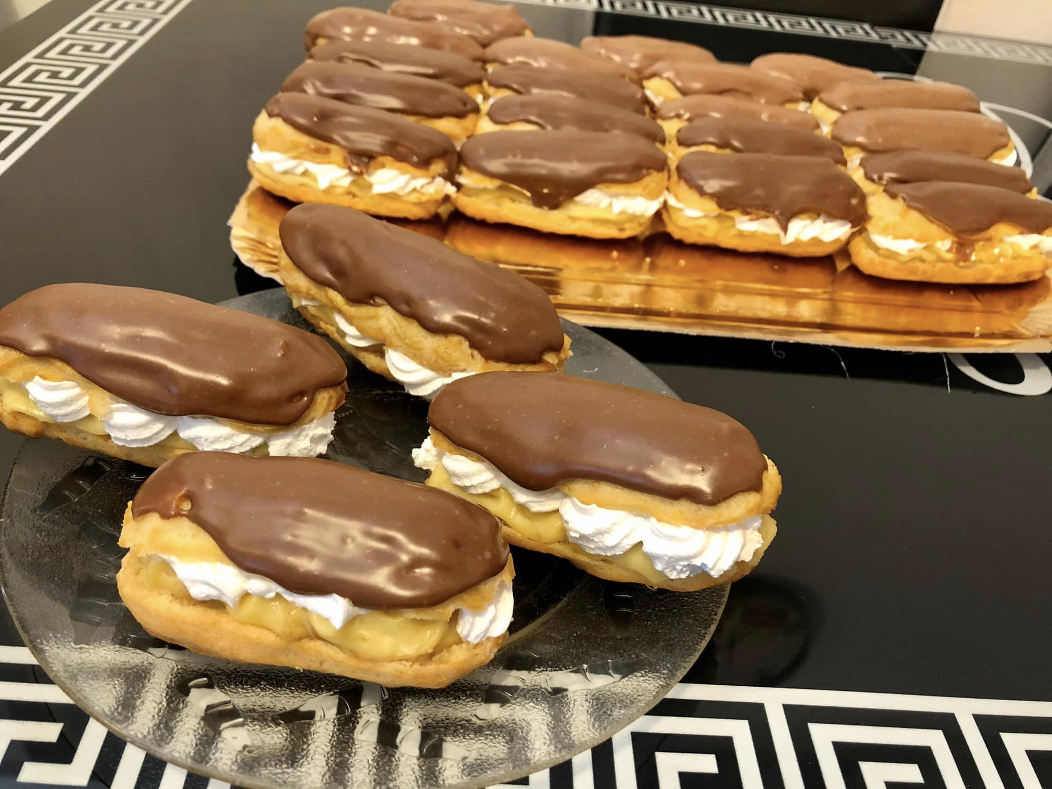 Κόβουμε τα εκλερ και τα γεμίζουμε με κρέμα, μπορούμε να προσθέσουμε και σαντιγί, είναι ακόμα πιο νόστιμα.