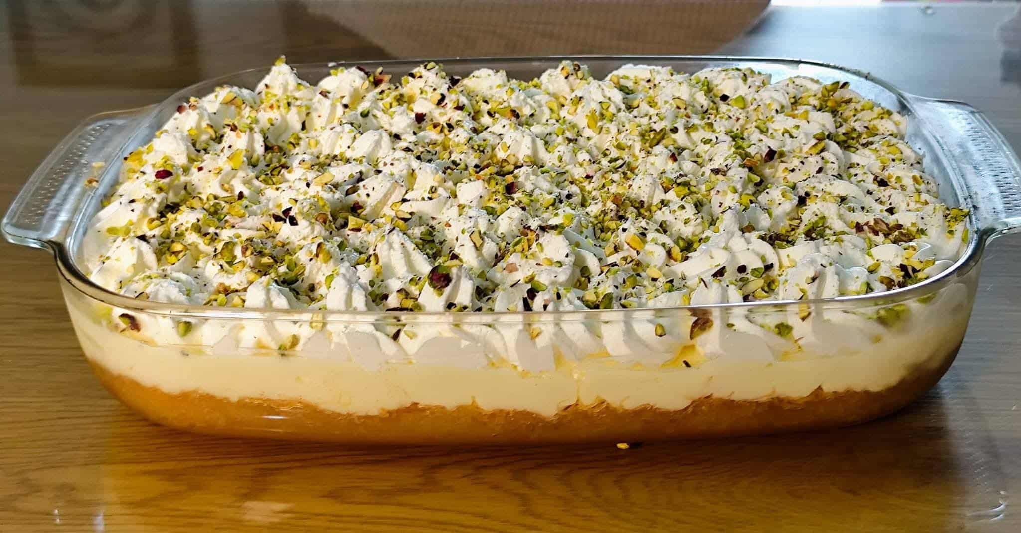 Ένα πλούσιο κομμάτι εκμέκ κανταΐφι με στρώσεις από σιροπιασμένη βάση, κρέμα και σαντιγί, πασπαλισμένο με πράσινο φιστίκι Αιγίνης.