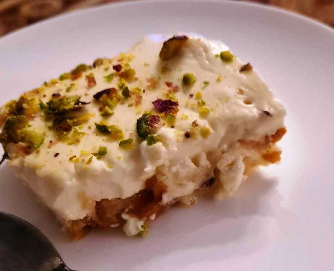 να πήξει η κρέμα και αφήστε την στην άκρη να κρυώσει για 1 ώρα. Πασπαλίζουμε με τα αλεσμένα φιστίκια Αιγίνης και τα βάζουμε στο ψυγείο για 2 ώρες. Σερβίρετε κρύο με επιπλέον σιρόπι στο πλάι.