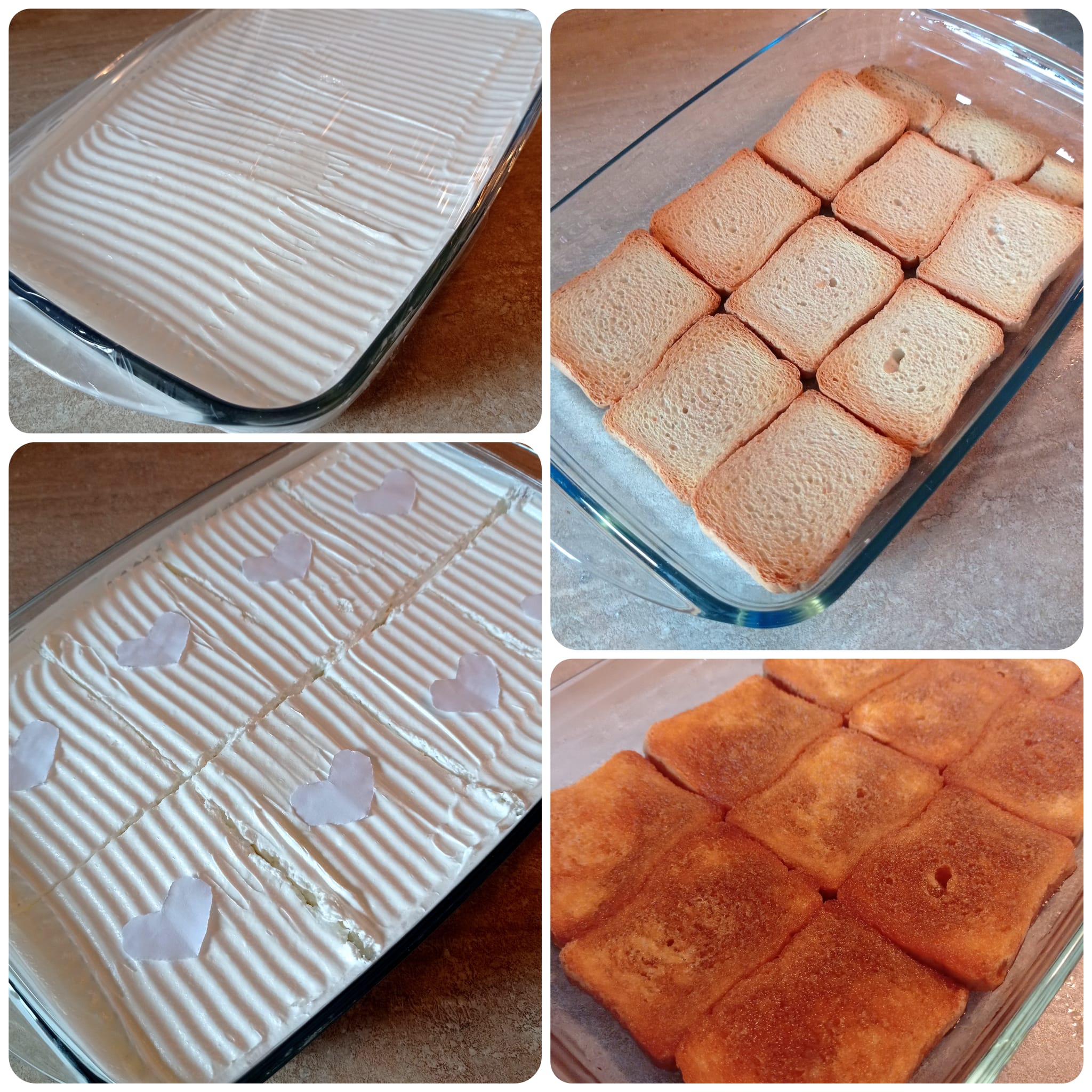 Αφού κρυώσει, ριχνουμε τη στρώση κρέμας*, κλείνουμε από πάνω με μεμβράνη και φυλάμε για αρκετές ώρες (ολονύκτιο) στο ψυγείο.