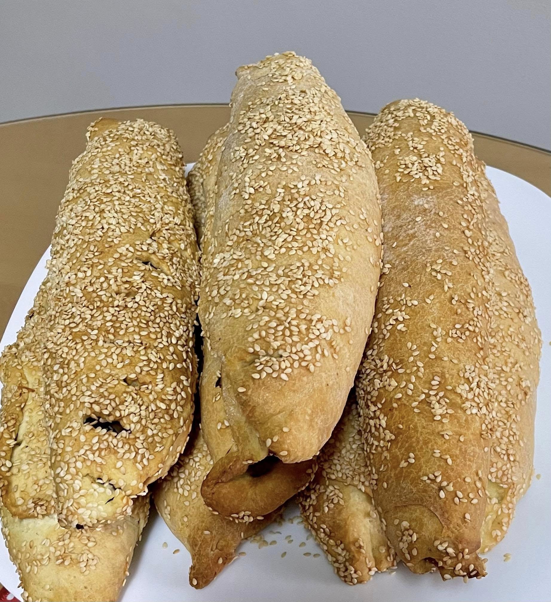 Ετοιμάζομαι την γέμιση. Ανοίγουμε το φύλλο. ((190γρ.περίπου το καθένα) Το μετράμε αν θέλουμε με ένα πιάτο 26 εκατοστά. Χαράζουμε 1 1/2 εκατοστό μέσα τα ανοίγματα. Με το εργαλείο που κόβουν την πίτσα. Στο 1 1/2 εκατοστό αλείφουμε με νερό όταν τις τυλίγουμε για να κολλά να μην ανοίξουν και φουσκώσουν. Στο υπόλοιπο φύλλο απλώνουμε τη γέμιση και τυλίγουμε σε σχήμα κυλίνδρου. Πασπαλίζουμε με σουσάμι αν θέλουμε.Ψήνουμε σε προθερμασμένο φούρνο στους 180 βαθμούς μέχρι να ροδοκοκκινίσουν γύρω στα 40 λεπτά.