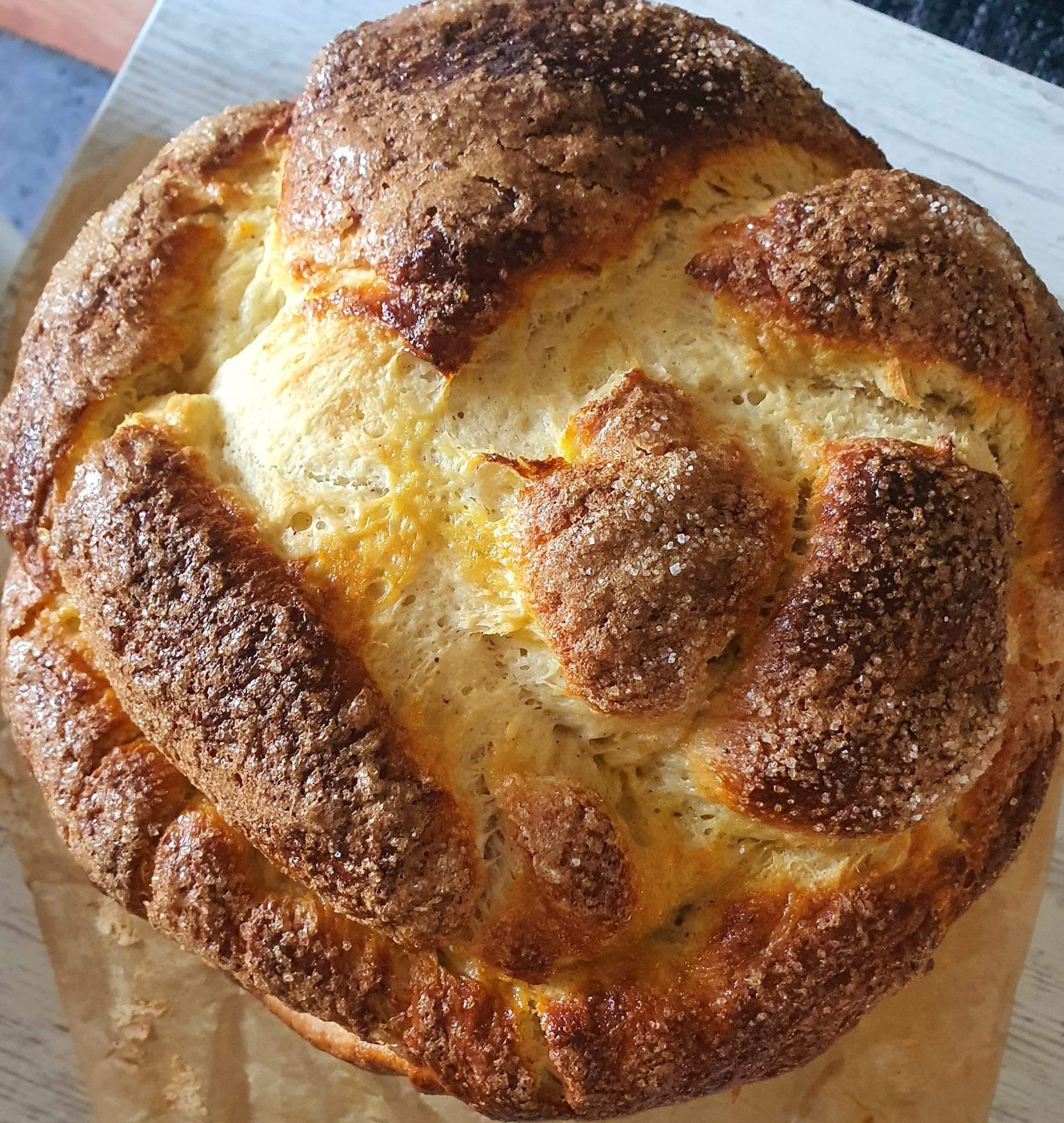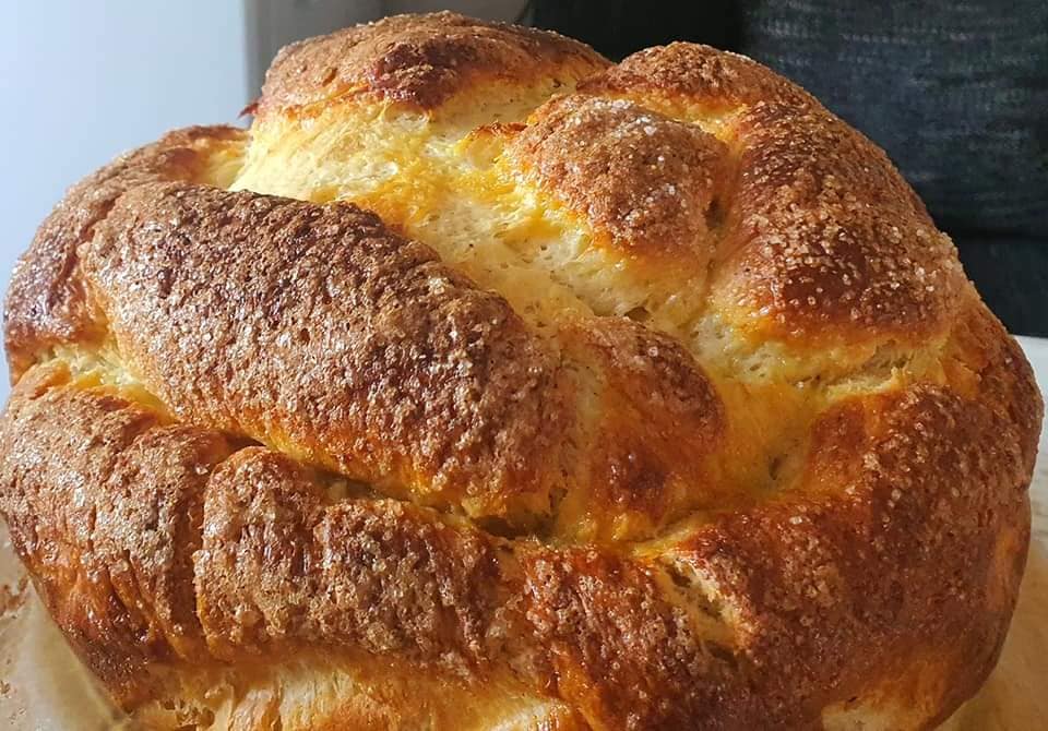 μεμβράνη, το αφήνω να φουσκώσει μέχρι να διπλασιαστεί σε όγκο. Όταν γίνει αυτό, το βγάζω στον πάγκο και πολύ απαλά, χωρίς να ανακατεύω, το χωρίζω στα δύο. Τραβάω και στρίβω, γυρίζοντας το κορδονι από τη μια πλευρά με το ένα χέρι και προς την αλλη με το άλλο. Μετά πλέκω τα δύο κορδονια. Το βάζω σε ταψί διαμέτρου 24 εκ. σε χαρτί ψησίματος και το αφήνω να φουσκώσει λίγο, τυλιγμένο με μεμβράνη. Αλείφουμε με το αυγό χτυπημένο με λίγο λάδι, πασπαλίζουμε με ζάχαρη άφθονα.