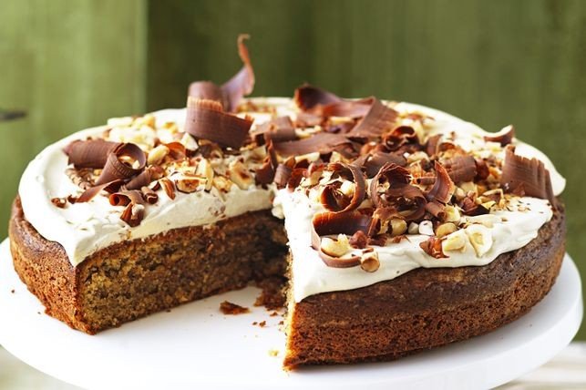 Απλώστε πάνω από το κέικ την κρέμα του καφέ και πασπαλίστε με τα ψιλοκομμένα φουντούκια και τριμένη σοκολάτα.