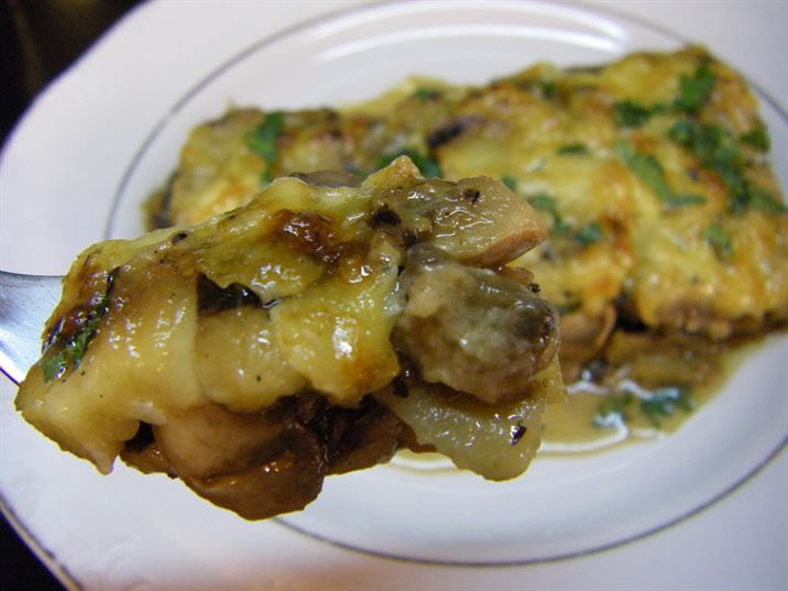 Καθαρίζουμε τα μανιτάρια και τα κόβουμε σε μεγάλα κομμάτια. Σε ένα ταψί αλειμμένο με λαδι βάζουμε τις μελιτζάνες πάνω από τα μανιτάρια,