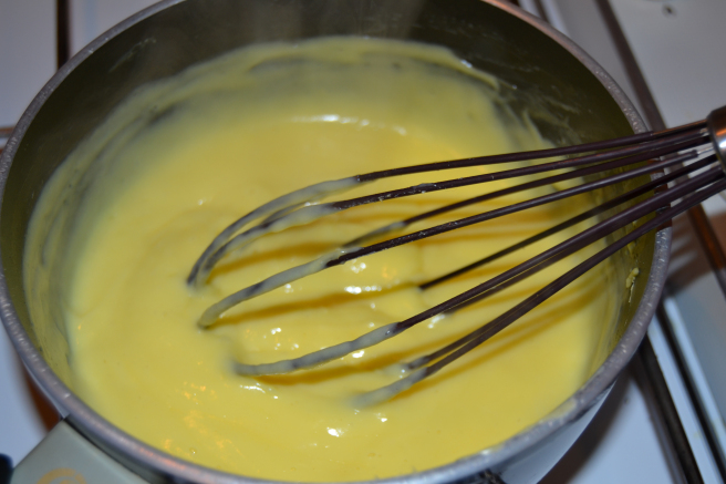 Τώρα προετοιμάστε την κρέμα βάζοντας τους κρόκους με τη ζάχαρη σε ένα αντικολλητικό τηγανι και αρχίστε να ανακατεύετε με ένα σύρμα, και στη συνέχεια προσθέστε το αλεύρι και τελικά ρίξτε και το γάλα. Μαγειρεύουμε μέχρι να πάρουμε μια κρέμα τη σωστή συνοχή.