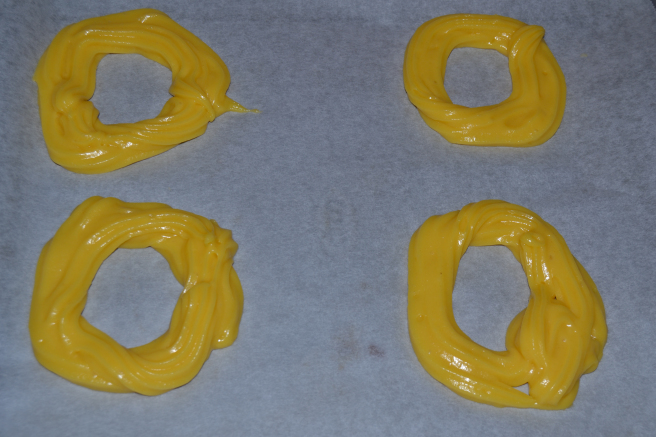 Αρχίζουμε προετοιμάζοντας τη ζύμη για τα “Σου”, βάζουμε το βούτυρο με το νερό, τη ζάχαρη και μια πρέζα αλάτι σε μια κατσαρόλα. Μόλις το βούτυρο λιωθεί και το νερό αρχίσει να βράζει, αφαιρέστε την κατσαρόλα από τη φωτιά και προσθέστε το κοσκινισμένο αλεύρι. Ανακατέψτε τα πάντα με ένα ξύλινο κουτάλι μέχρι να δημιουργηθεί μια ομοιογενής μάζα, βάλτε το πάλι στη φωτιά για περίπου πέντε λεπτά, ανακατεύοντας συνεχώς μέχρι να σχηματιστεί μια λευκή πατίνα στο κάτω μέρος της κατσαρόλας. Όταν κρυώσει προσθέτουμε ένα αυγό κάθε φορά στη ζύμη, μόλις απορροφήσει το αυγό μπορούμε να προσθέσουμε το άλλο και ούτω καθεξής.Όταν η ζύμη είναι ομαλή και ομοιογενής το βάζουμε σε μία σακούλα ζαχαροπλαστικής με αστεροειδές ακροφύσιο, και σε ένα ταψί στρωμένο με χαρτί ψησίματος, θα δημιουργήσουμε μεγάλους κύκλους διαχωρίζοντάς τους καλά.