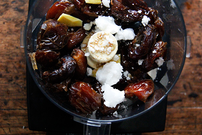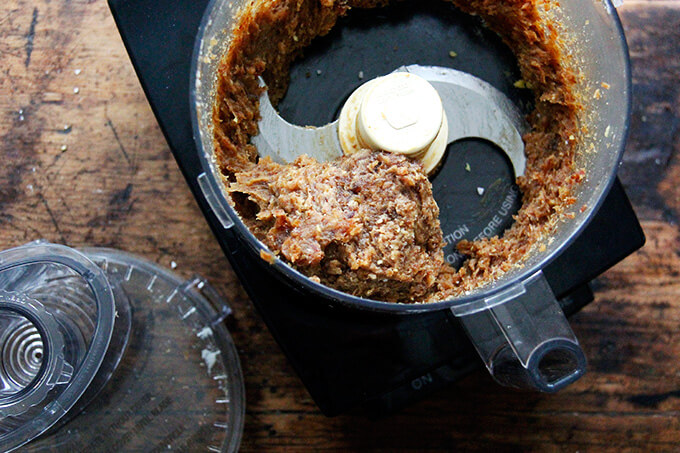 Συνδυάστε τα υπόλοιπα συστατικά σε έναν μπλεντερ τροφίμων και χτυπήστε για επεξεργασία μέχρι να σχηματιστεί μια “μπάλα”.