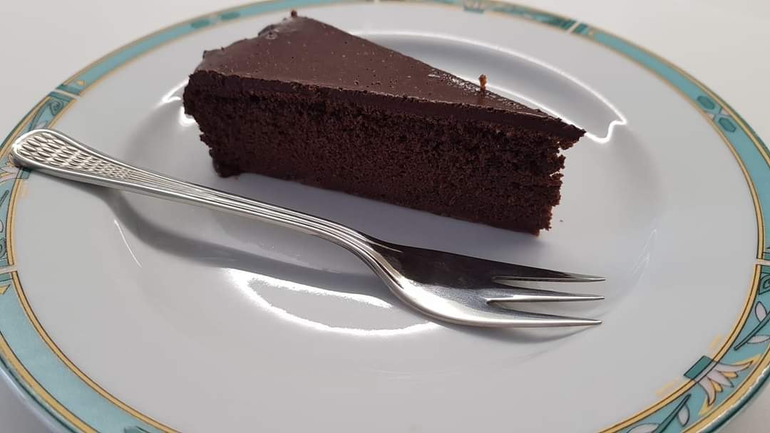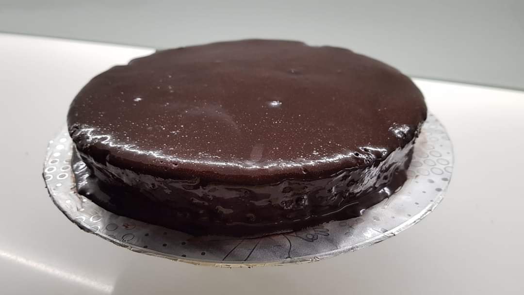 Στην αρχή το κεικ φουσκώνει, μετά πέφτει, αυτό είναι φυσιολογικό. Αφού κρυώσει, ρίχνουμε από πάνω τη γκανάς και τη βάζουμε στο ψυγείο για τουλάχιστον μία ώρα.