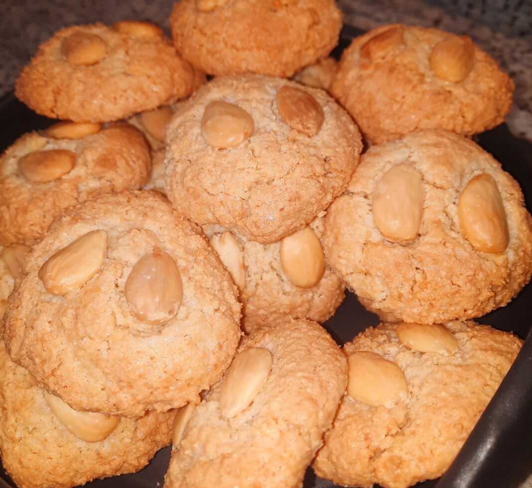 Στη λαμαρίνα του φούρνου στρώνουμε μια βρεγμένη λαδόκολλα για να μη μας κολλήσουν τα γλυκάκια Πλάθουμε μικρά μπαλάκια των 30 γρ και τα τοποθετούμε με απόσταση μεταξύ τους Στην κορυφή κάθε εργολάβου μπήγουμε ένα ολόκληρο ωμό αμύγδαλο