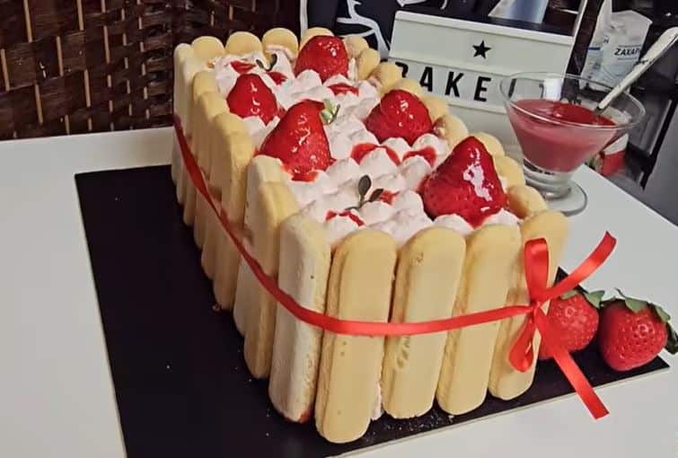 Βουτάμε τα σαβουαγιάρ στη σάλτσα φράουλας και τα τοποθετούμε πάνω σε λαδόκολλα σχηματίζοντας τη βάση. Χρησιμοποιούμε στεγνά σαβουαγιάρ για τα τοιχώματα περιμετρικά. Απλώνουμε γενναιόδωρες στρώσεις κρέμας και μπισκότων μέχρι να τελειώσουν τα υλικά μας Σταθεροποιούμε το γλυκό δένοντάς το με μια κορδέλα και διακοσμούμε με την υπόλοιπη σάλτσα και φρέσκες φράουλες. Αφήνουμε στο ψυγείο για 3 ώρες Κάθε φορά που μας γράφετε ένα σχόλιο νιώθουμε πως η προσπάθειά μας αναγνωρίζεται και αυτό είναι η μεγαλύτερη ανταμοιβή μας.