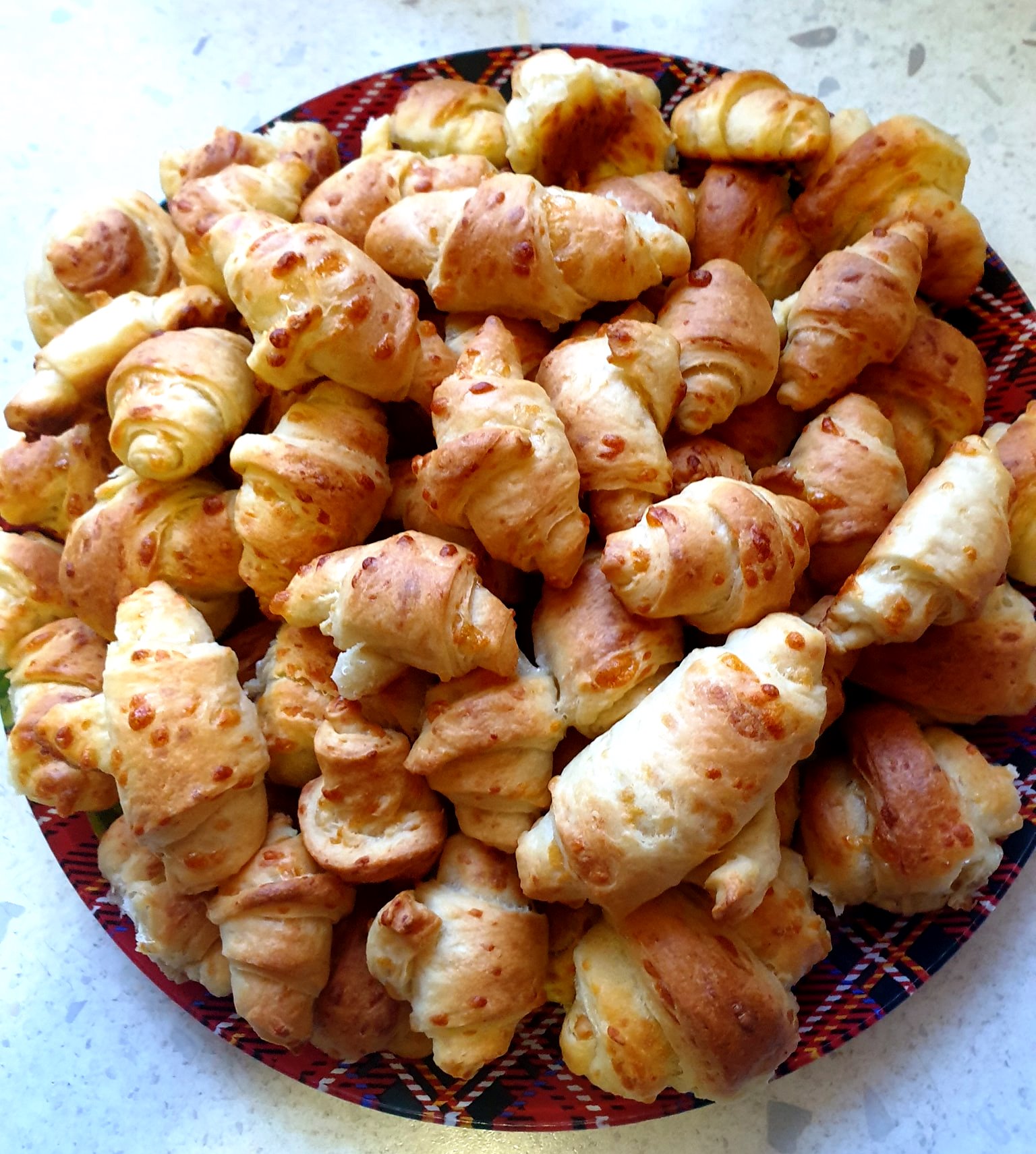 Χωρίζουμε την ζύμη σε 4 ίσα μπαλάκια. Παίρνουμε ένα μπαλάκι και ανοίγουμε ένα στρογγυλό φύλλο με την βοήθεια ενός πλάστη. Με την βοήθεια ενός μαχαιριού χωρίζουμε την στρογγυλή ζύμη σε 8 ίσα σχεδόν τρίγωνα κομμάτια, όπως κόβουμε την πίτσα και τα τυλίγουμε. Ψήστε σε προθερμασμένο φούρνο στους 200 ° μέχρι να είναι έτοιμο (περίπου 20-30 λεπτά)