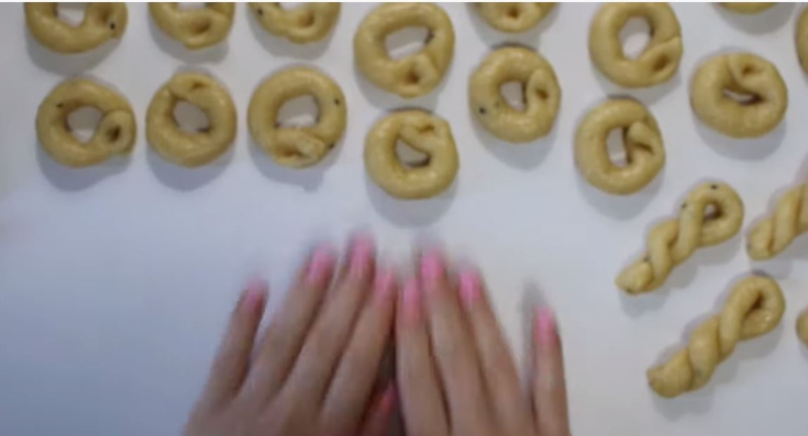 Σκεπάζουμε και αφήνουμε να ξεκουραστεί για 1 ώρα . Παίρνουμε 30-40 γραμμάρια και πλάθουμε με το χερια ένα κορδόνι και και φτιάχνουμε στρογγυλά ή κοτσίδες μέχρι να εξαντληθεί η ζύμη.