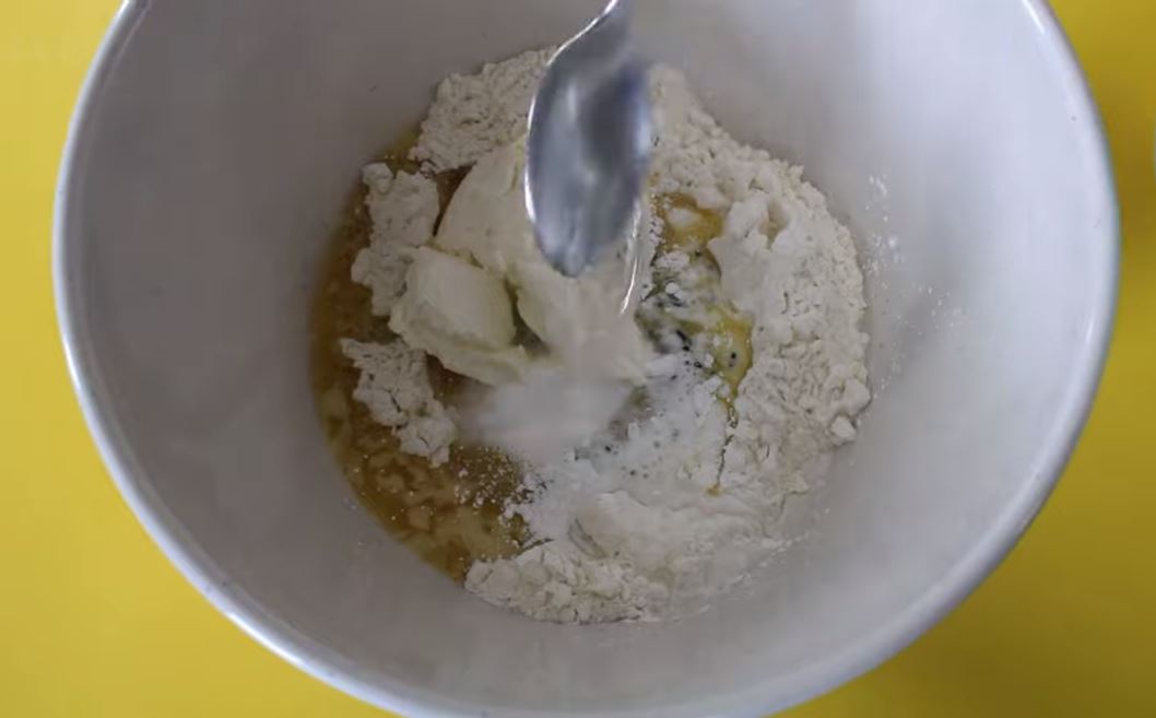 Μετα προσθέτουμε και το αυγό, μαχλέπι, ζάχαρη , σουσάμι , τυρί κρέμα , μπεικιν , νερό και ξεκινάμε να ζυμώνουμε με τα χέρια μέχρι να φτιάξουμε μια ωραία μπισκοτένια ζύμη.