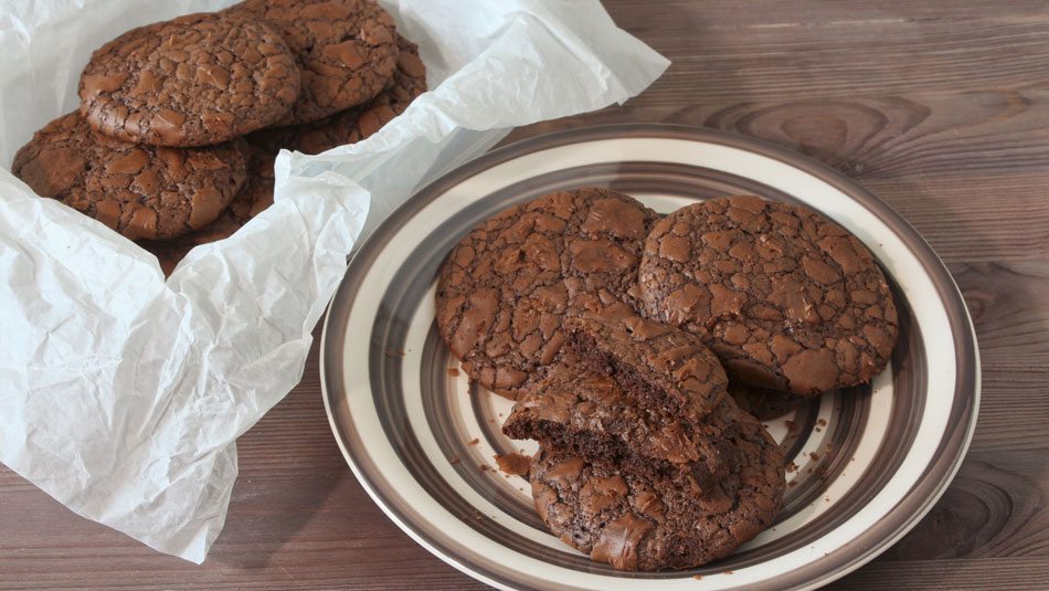 Σε μια κατσαρόλα, προσθέστε το βούτυρο και ένα φλιτζάνι τσιπς σοκολάτας, ανακατεύοντας σε χαμηλή φωτιά. Ανακατέψτε μέχρι να λιώσει. Βγάλτε από τη θερμότητα και ανακατεύετε σε καφέ ζάχαρη. Αφήστε να καθίσει 5 λεπτά. Ανακατέψτε τα αυγά και τη βανίλια, το αλεύρι, τη σκόνη κακάου και το αλάτι. Ρίξτε και τα υπόλοιπα κομμάτια σοκολάτας.