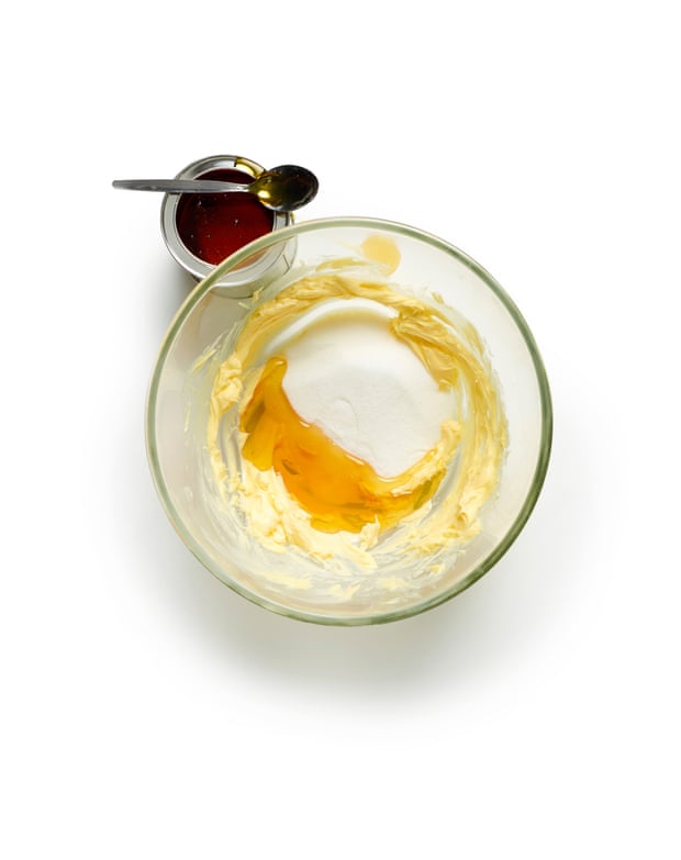 Βάλτε το βούτυρο σε ένα μίξερ και χτυπήστε ελαφρά για να το μαλακώσετε, στη συνέχεια προσθέστε τη ζάχαρη και το σιρόπι και χτυπήστε στη μεσαία ταχύτητα για περίπου πέντε – έξι λεπτά, μέχρι να γίνει αφράτο.